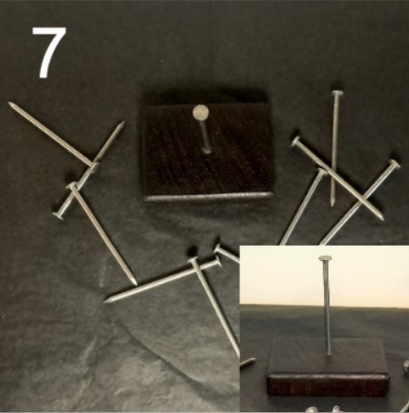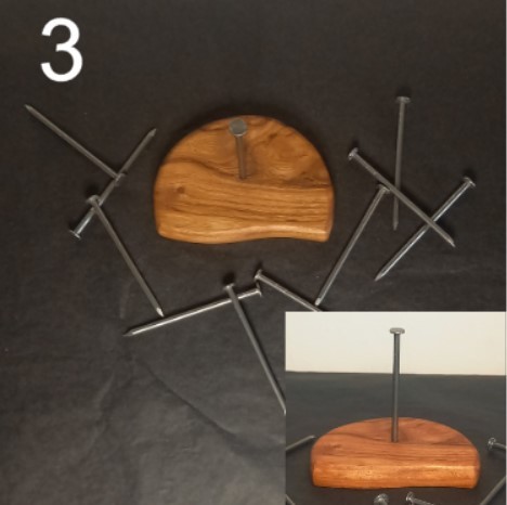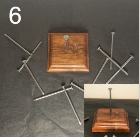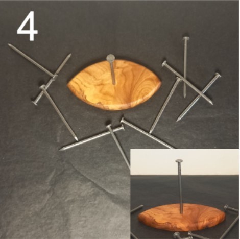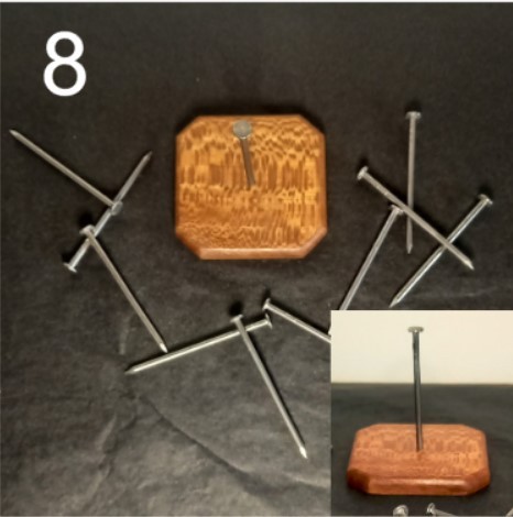 Choisissez une belle base en bois, avec un clou bien en évidence fixé en son centre. Ce clou, c'est votre point d'ancrage, votre guide dans cette aventure. Le but ? Arriver à faire tenir les 10 autres clous sur celui-ci. Oui, un vrai casse-tête qui mettra à l'épreuve votre habileté, votre patience et votre sens de l'équilibre !